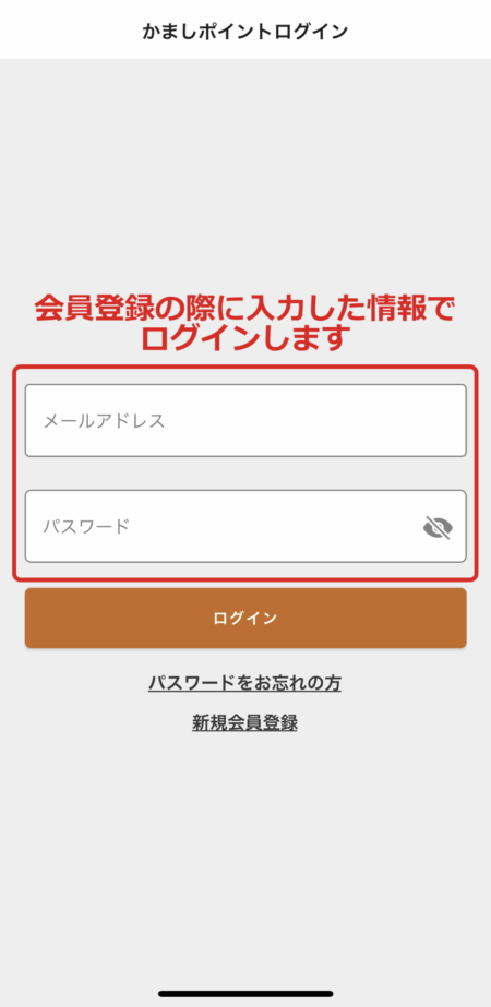 - ログイン画面が表示されますので、会員登録で入力した情報(メールアドレス・パスワード)を入力してログインのボタンを押します。